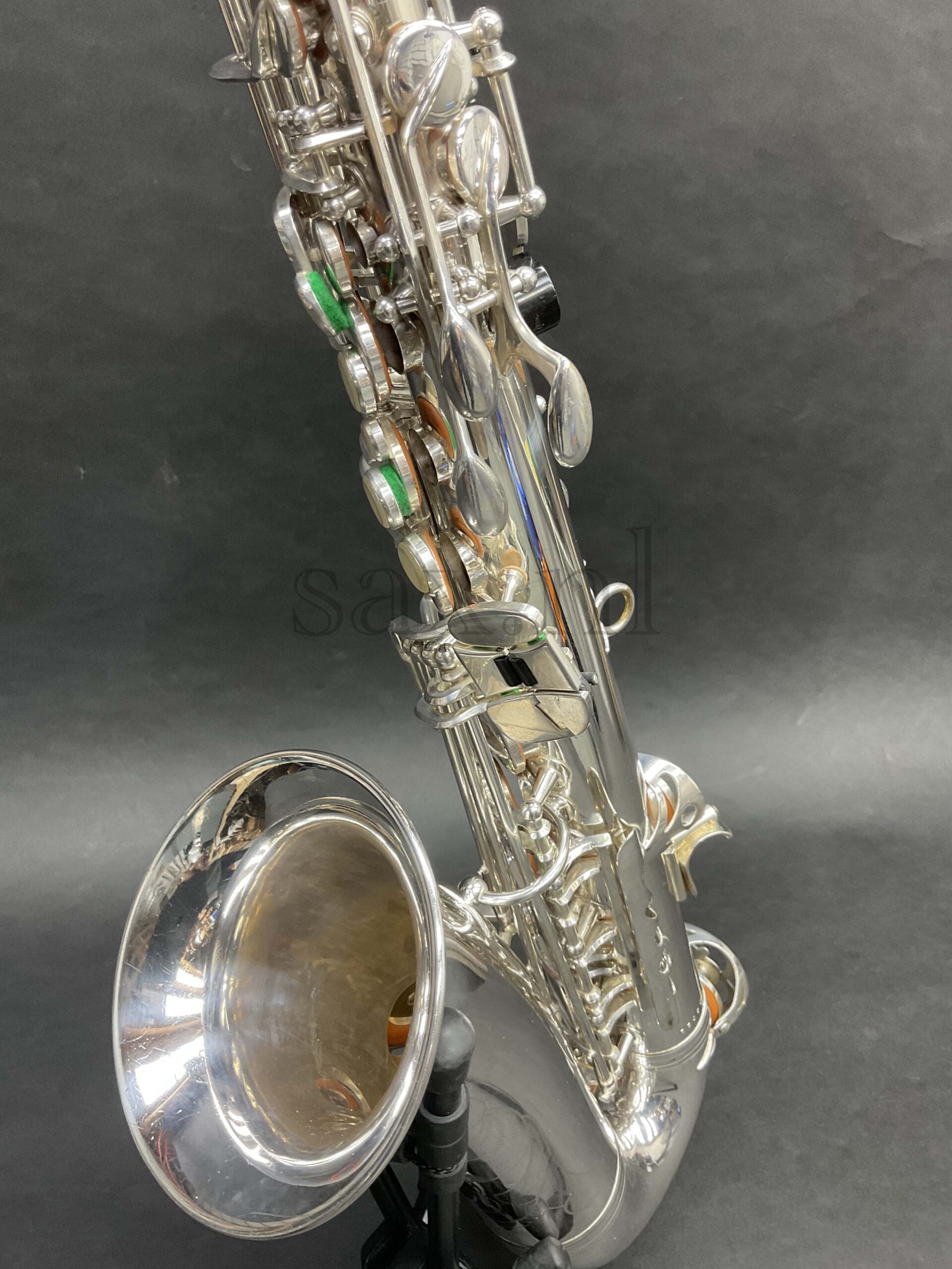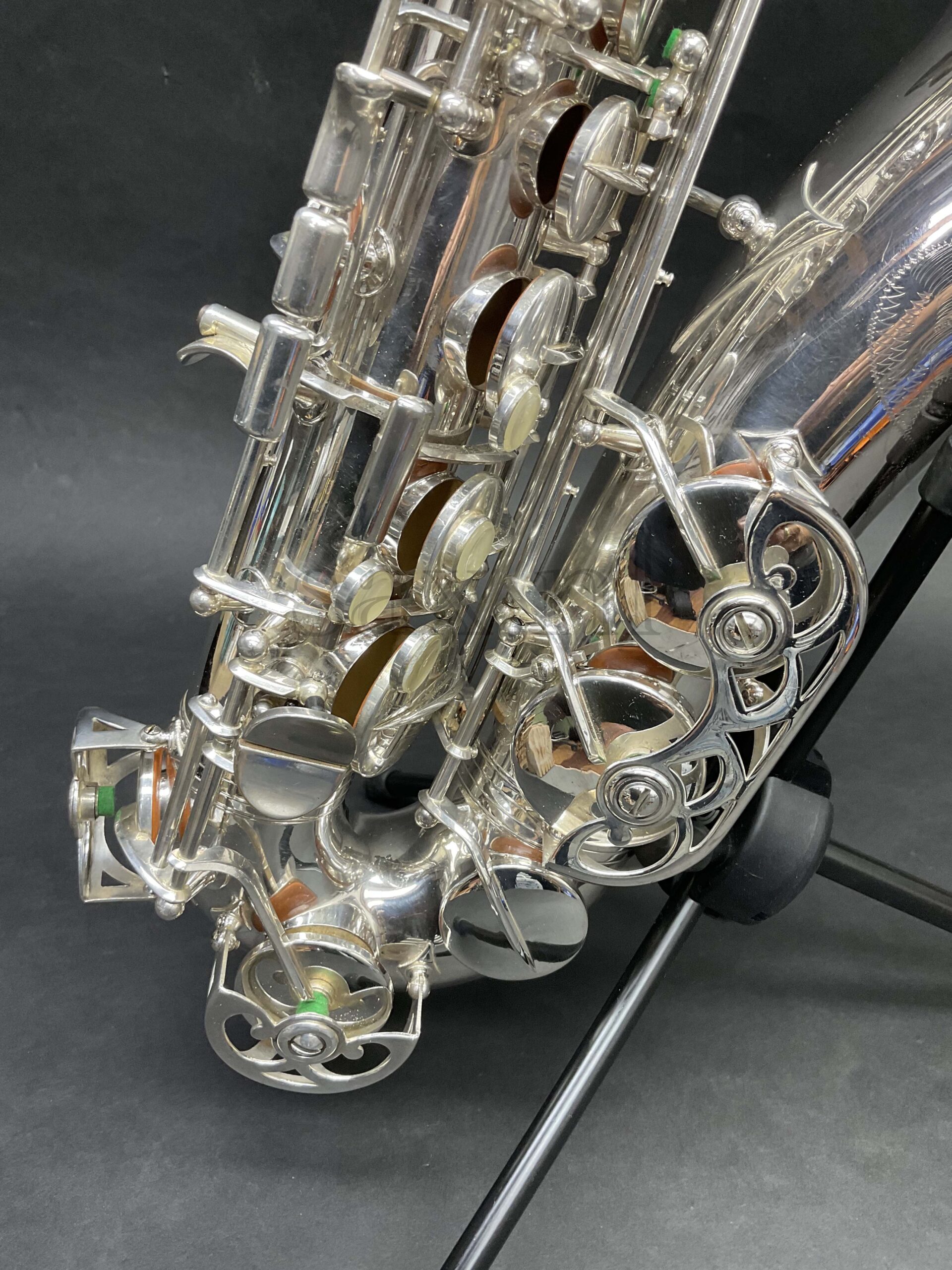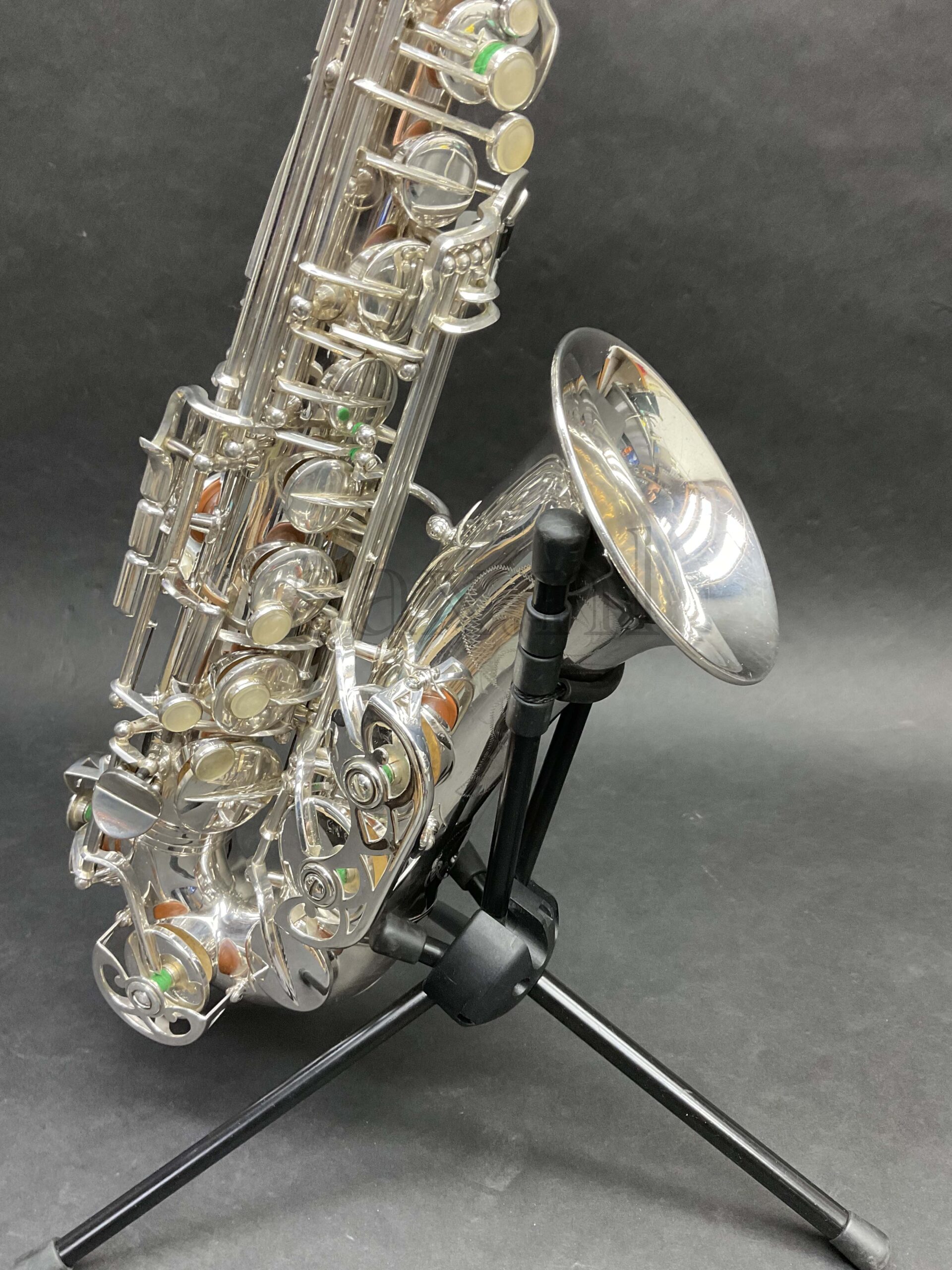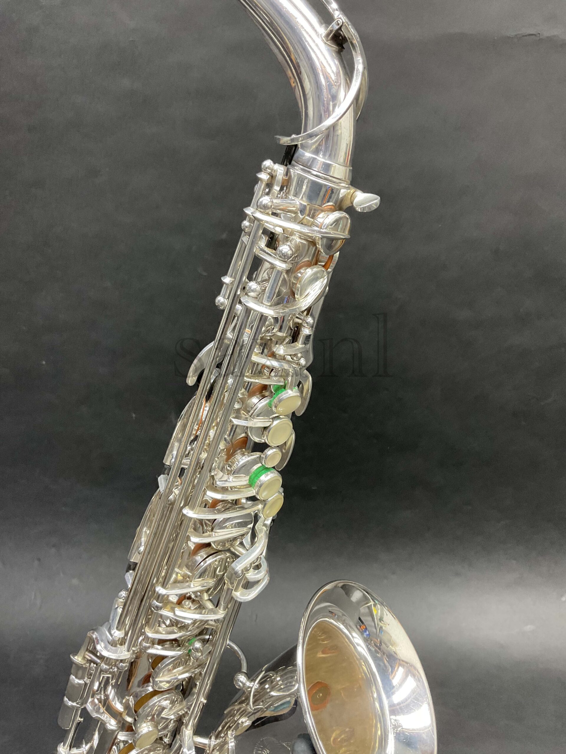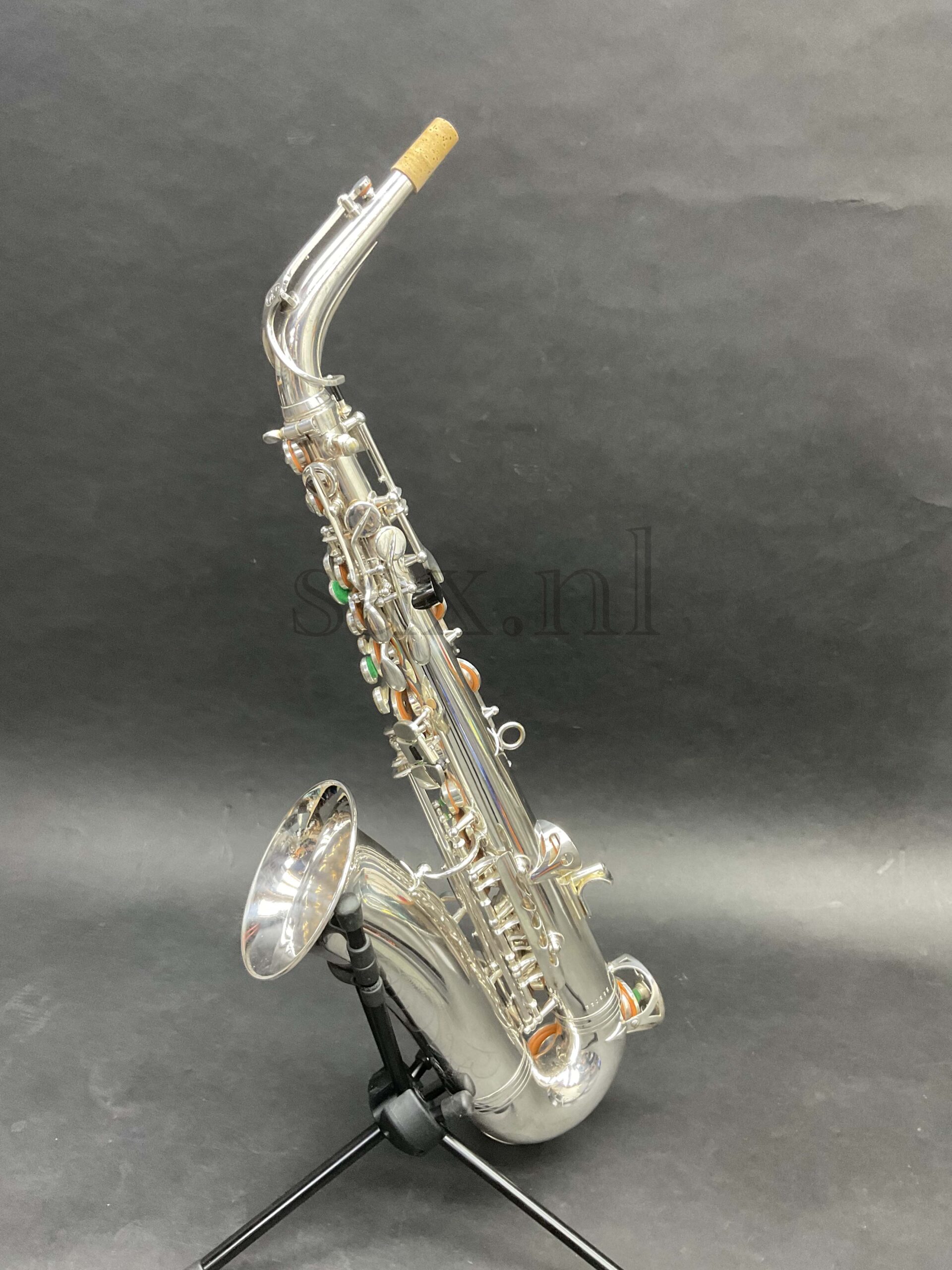 Deze saxofoon leent zich in eerste instantie voor klassieke toepassingen. De verzilverde uitvoering zorgt voor ongekende projectie en een fantastische toon en dynamiek. Van fluisterzacht tot fortissimo in orkest, saxofoonkwartet of solistisch: deze saxofoon kan het allemaal. De originele zilverlaag verkeert in nieuwstaat: minieme sporen van gebruik. Mechanisch perfect, geen speling op de kleppen.
